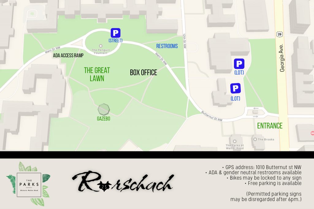 Rorschach will follow CDC and local guidelines with regard to outdoor masking requirements at the time of the performances. Audiences will have appropriately distanced seating areas throughout the Great Lawn. Hand sanitizer will be available and all Rorschach Theatre staff and artists will be vaccinated. All headphones will be disinfected between performances.