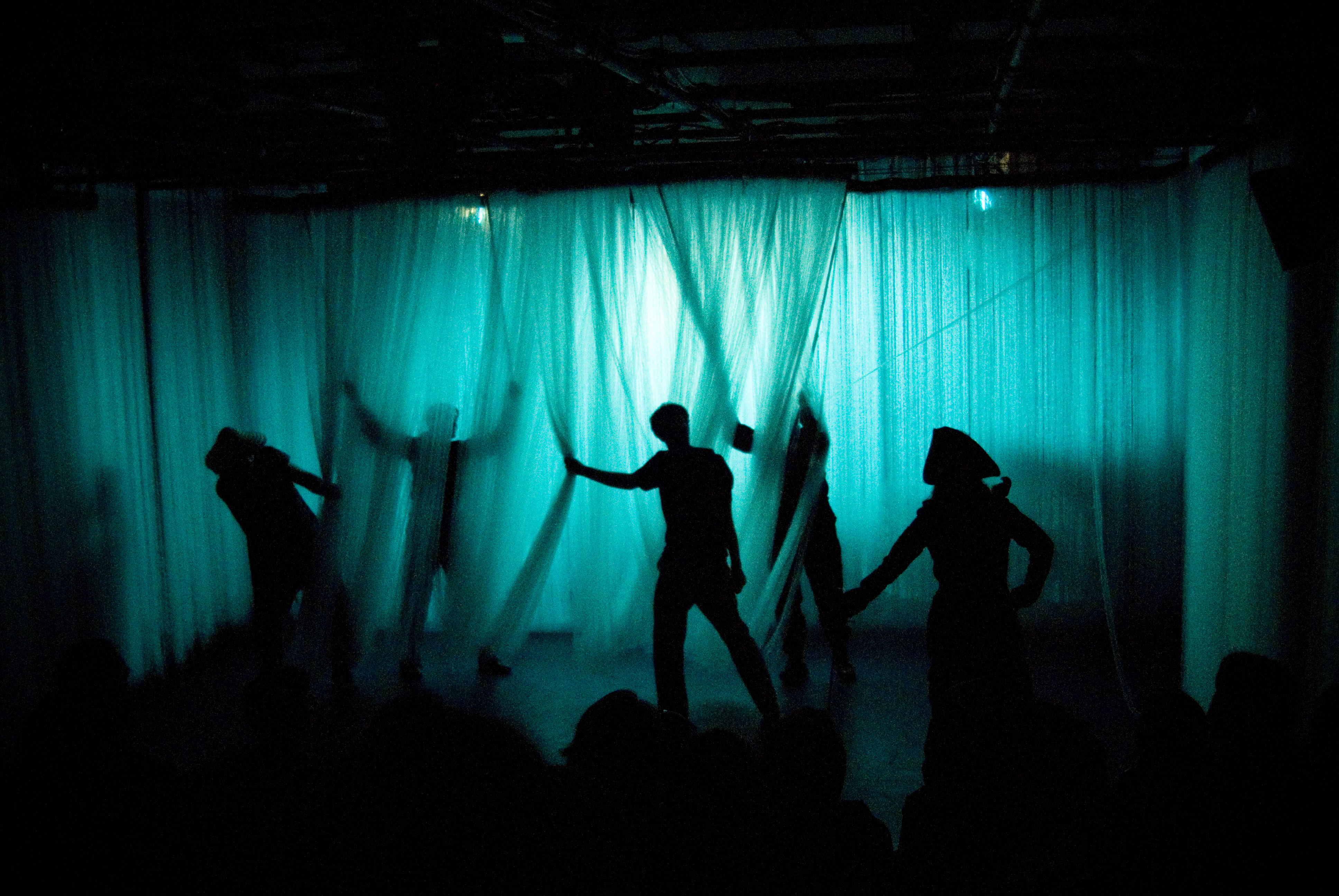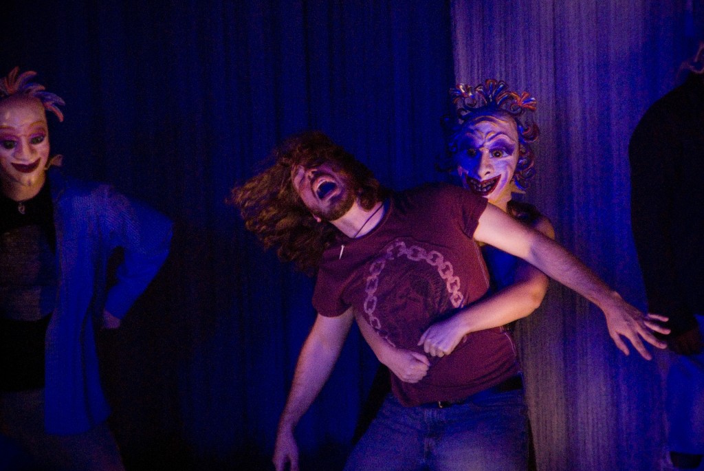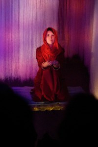 As all dreamers know, dreams aren’t static. These flash by, melt and merge into one another thanks to the creative team: Colin Hovde contributes great casting and brisk pacing; set designer Hannah J. Crowell designed a series of panels strung with what look like dried rice noodles (but aren’t) guided by quick footed stage hands, which quickly sluice through the front stage forming different slices of space; and the eerie quality to the dream and waking states are made vivid by the lighting and sound designs (John Burkland and Christopher Baine respectively).