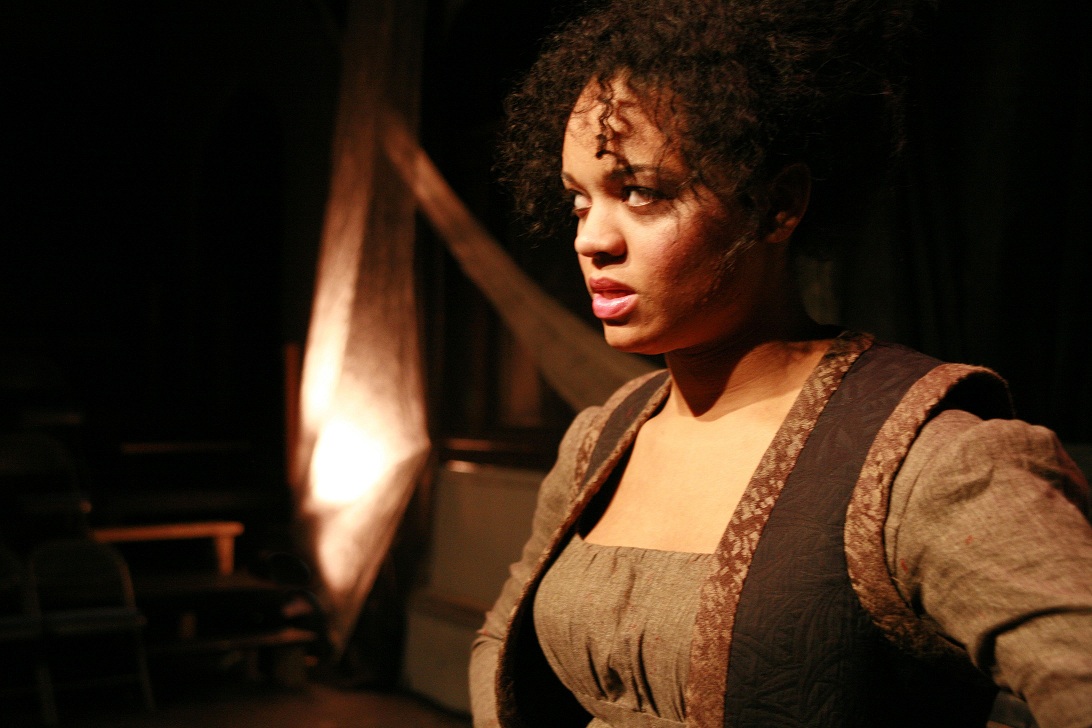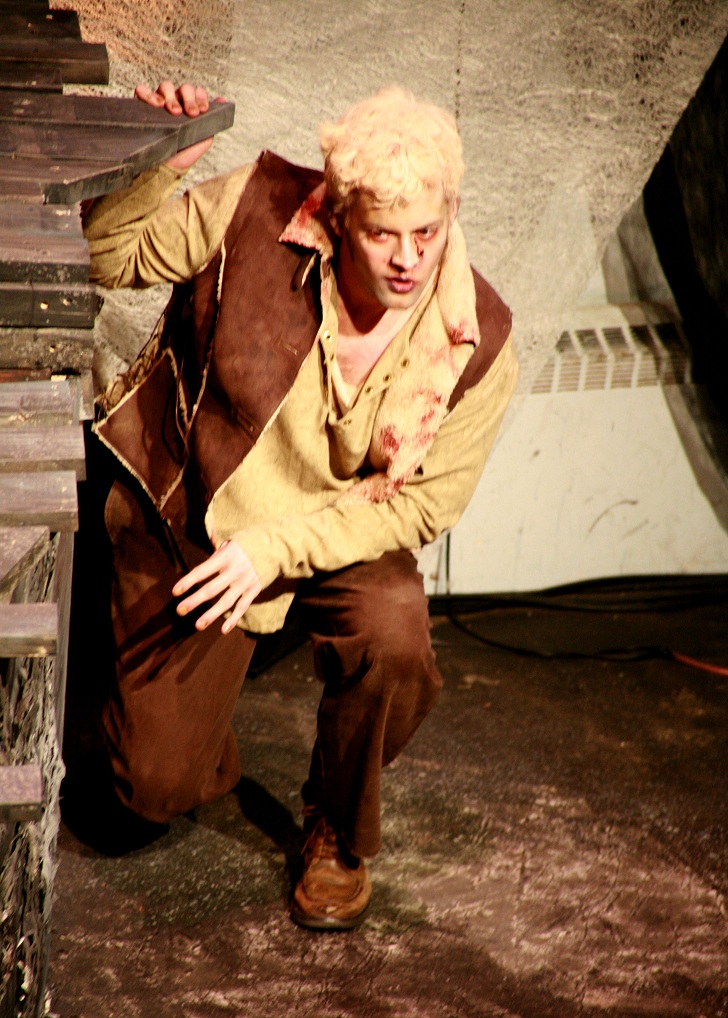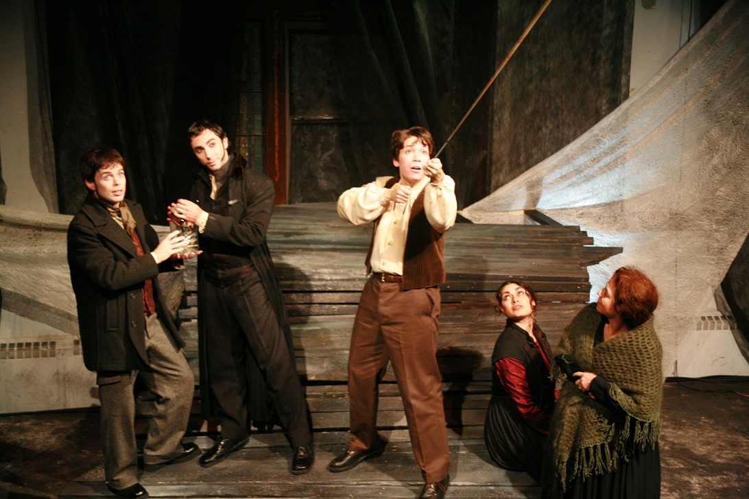 “Set Designer Debra Kim Sivigny builds a little wooden avalanche for actors to scramble and scrap and posture (and electrocute one another) upon, while swoops of that fabric frame a playing space that bleeds nicely out into the dark-arched recesses of Rorschach’s high-ceilinged home in the former Calvary Methodist sanctuary. There’s fun to be had with shadowplay (courtesy of lighting designer David C. Ghatan) and with various thunderclaps and heartbeat noises (William Burns) . . . –